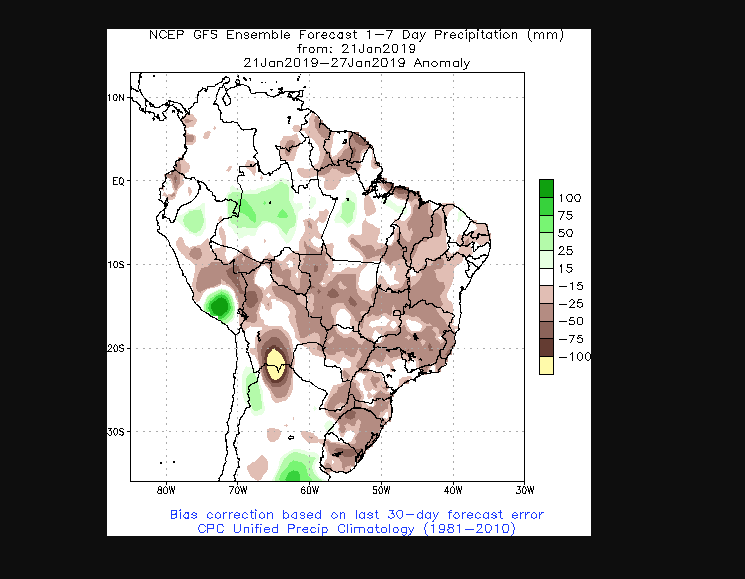 最后,对1月21日至1月27日7天降雨量的预测来看,依旧不乐观。巴西东南部咖啡主产区将持续干燥少雨,具体见下图: