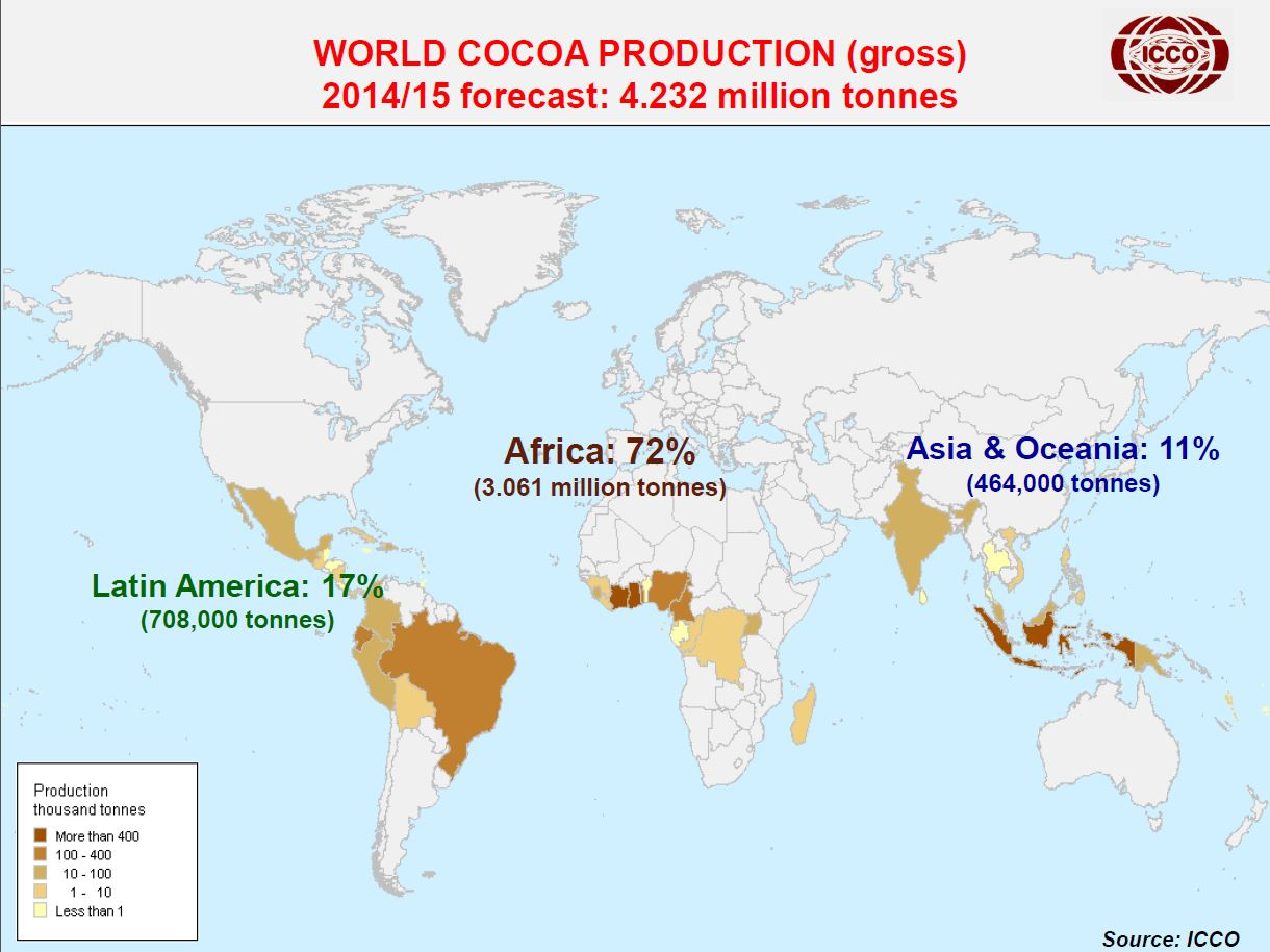 据国际可可组织(ICCO)统计,亚洲和大洋洲目前占全球可可供应量的11%,而非洲占72%。