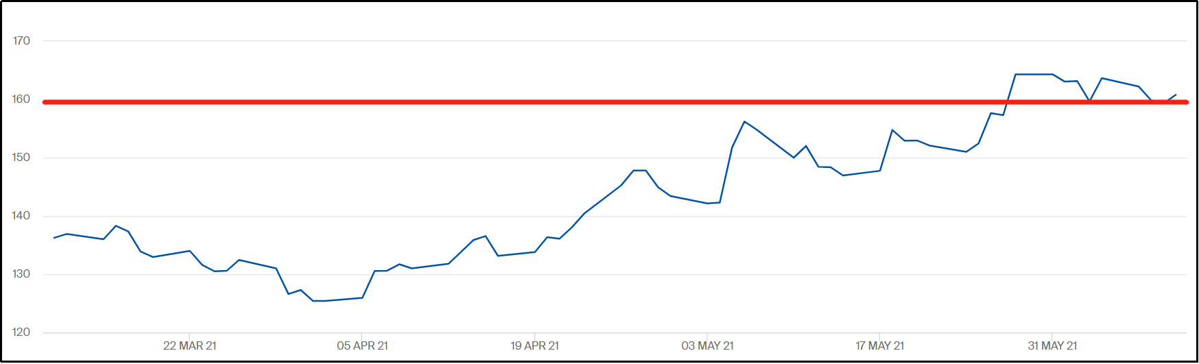 在经过4月和5月大幅上涨,期货价格触在突破160美分之后表现乏力,已经经历了一周多的技术调整,一直围绕着160美分整数关口上下波动,因此该价格已被认为是短期内牛熊的分水岭。
