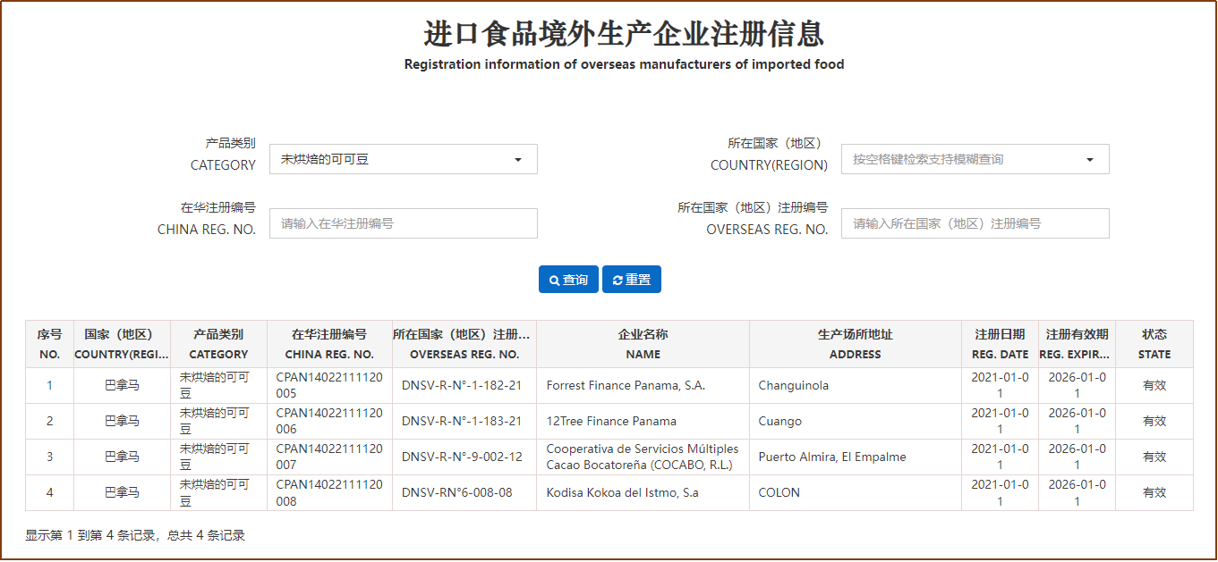 截至目前,“未烘焙的可可豆”产品类别下,仅有四家巴拿马企业成功注册,四家境外企业的有效期均为2021年1月1日至2026年1月1日。