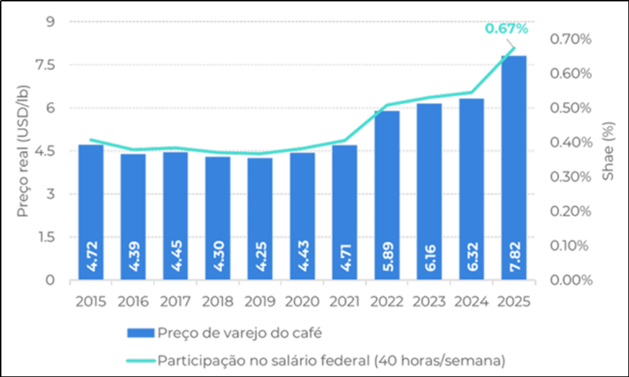 美国:咖啡零售价(美元/磅)和最低工资与咖啡价格比(%)