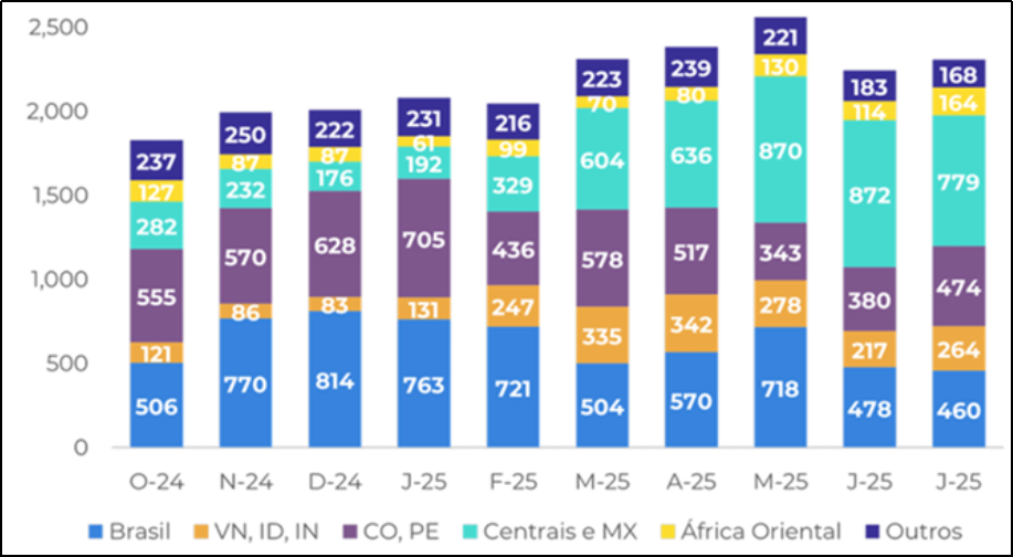 当前市场的差异和不确定性也降低了巴西农民对咖啡认证的兴趣,导致认证库存减少。在美国港口,虽然巴西的份额低于欧盟港口,但目前的关税也导致了这种原产地的份额减少,但来自中美洲和墨西哥的咖啡份额却有所增加。