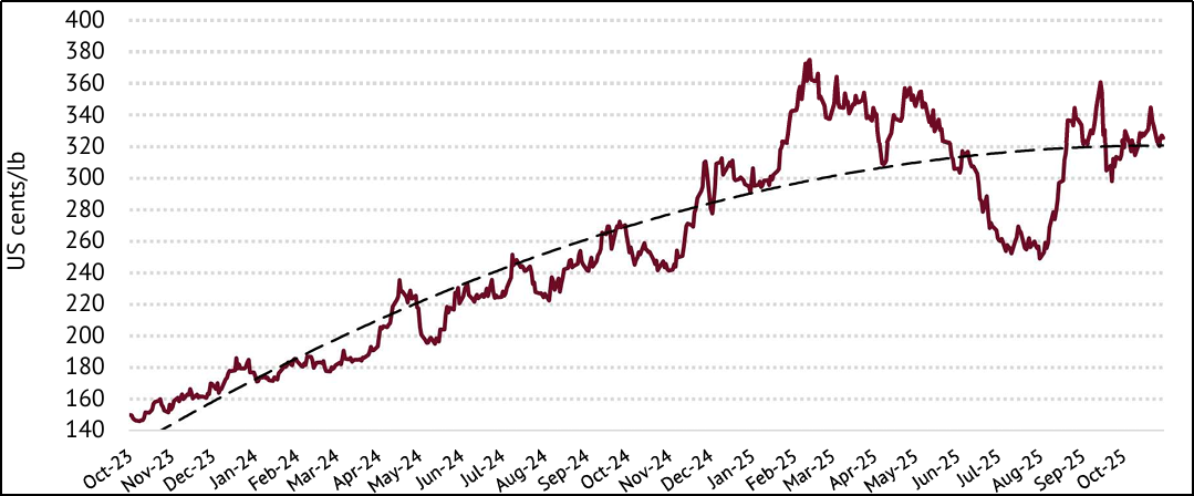 3. 飓风梅利莎对中美洲咖啡新产季供应带来负面影响,以及巴西产区少雨和缺乏劳动力也对价格起到积极作用。