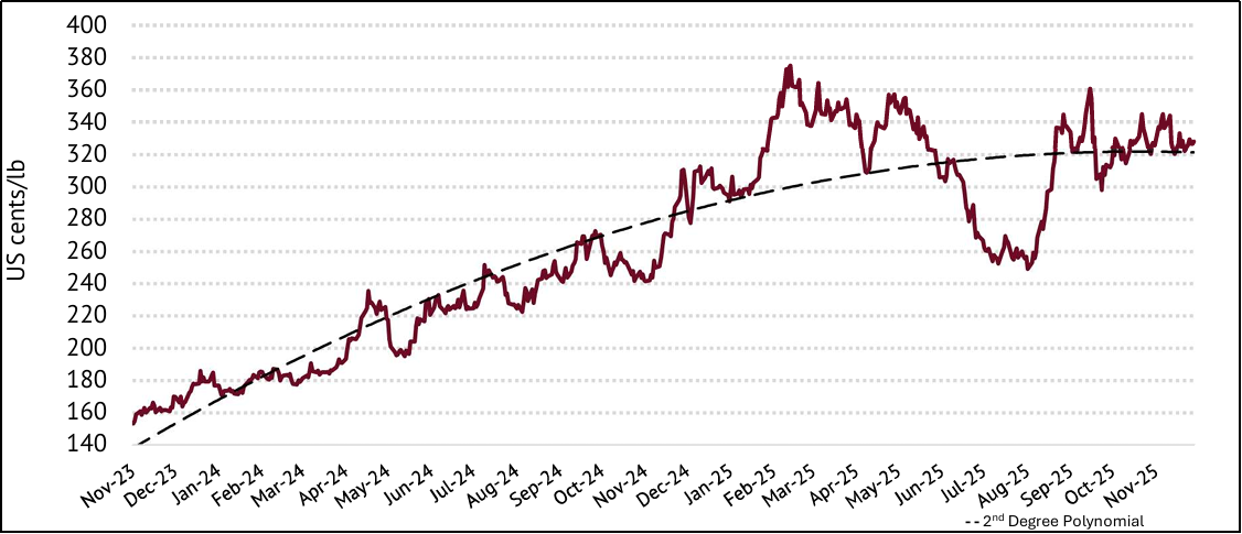 11月上半月,咖啡价格较为疲弱,主要因为美国政府取消了对巴西咖啡40%的加征关税。但进入下半月咖啡价格则出现较强走势,主要是因为越南咖啡产区的洪水影响到了新产季的咖啡收获和产量。