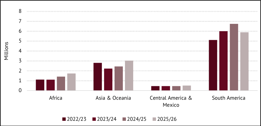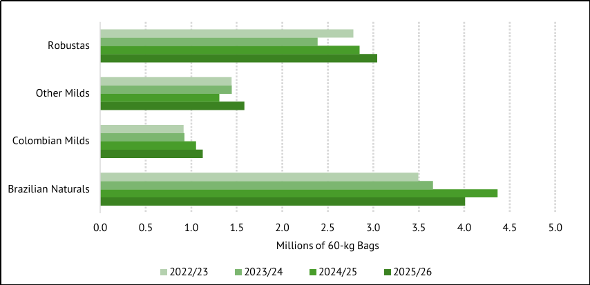 在10月,全球咖啡生豆出口数量共计976万袋,相比去年同期的957万袋增长1.9%,这是连续第二年在咖啡年度的首月出现创纪录出口,只是今年的增幅被收窄。除巴西日晒阿拉比卡咖啡出口数量减少外,其他都出现增长。具体表现如下: