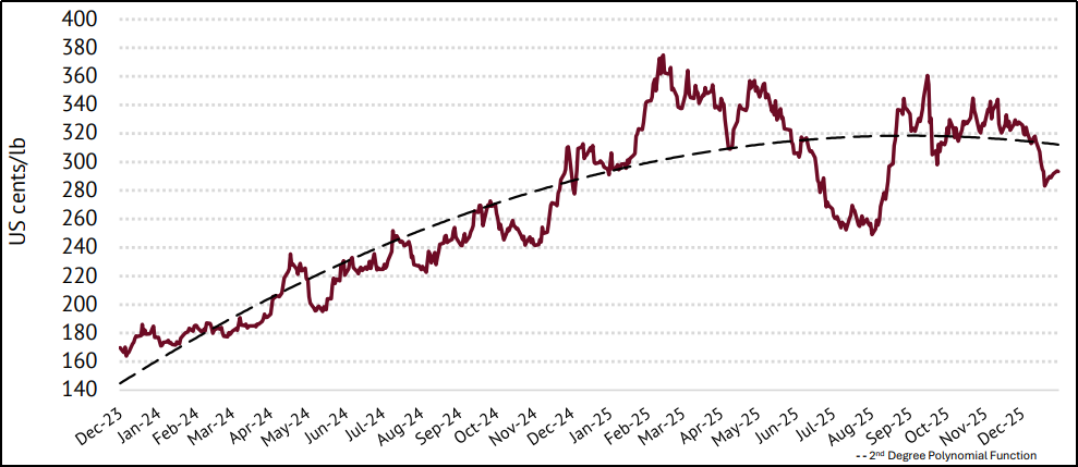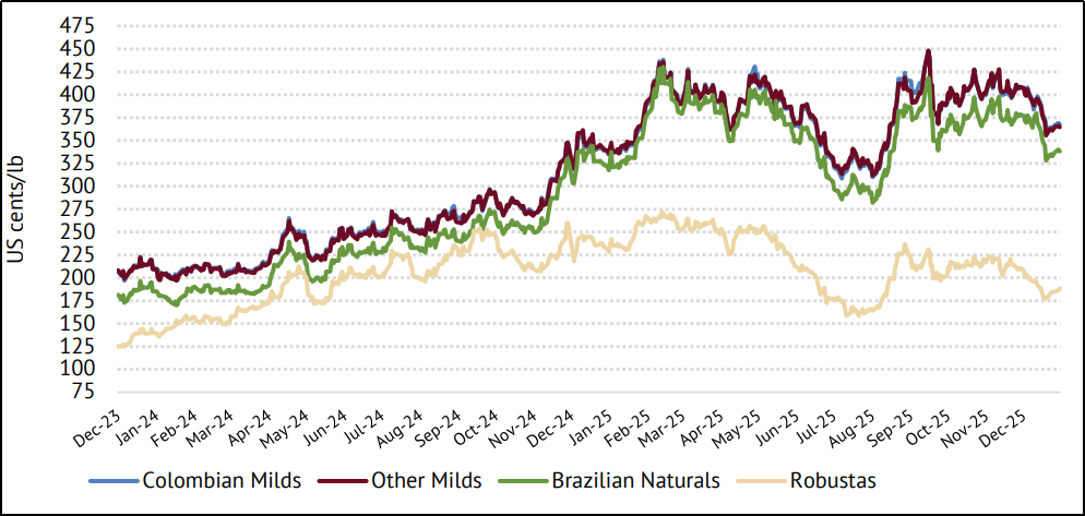 咖啡金融网(www.coffinance.com)消息,2025年12月国际咖啡组织(ICO)咖啡综合价格月度平均价格指数为304.68美分/磅,相比11月价格下跌7.8%。自2025年年中以来,咖啡价格明显处于趋势下跌之中。12月19日价格为283.21美分/磅,是自8月中旬以来首次跌破300美分/磅,但好在月末最后7个工作日累计上涨3.5%,最终收于293.09美分/磅。