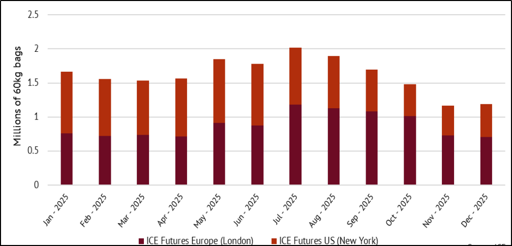 无论如何,在过去的四年里出现三次咖啡供应年度短缺,累计供应短缺1791万袋。同时欧盟咖啡库存数量大幅减少至786万袋,远低于2022/23年度初的1504万袋。交易所阿拉比卡咖啡认证库存数量也仅有48万袋,远低于2025年1月的91万袋。因此咖啡价格在供需关系扭转和低库存初期极为敏感,任何消息都可能让其剧烈波动,例如在12月份的表现。