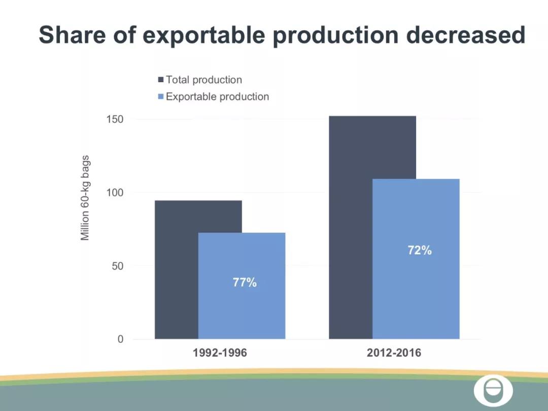 上圖是兩個時間段(1992~1996 VS 2012~2016)在咖啡總產量與可出口咖啡量的比較。全世界咖啡產量的增長,卻導致可出口咖啡量下降了5個百分點。這說明咖啡產國本國消費量和消費能力的增強。